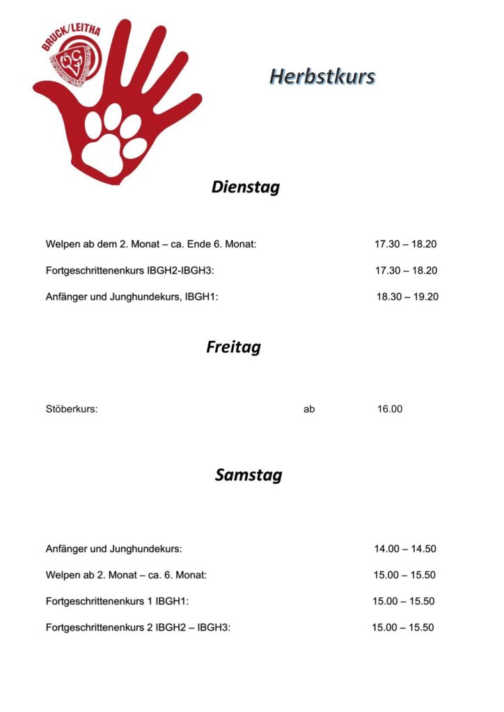 Einschreibungen für Unterordnungskurse ausschließlich am Samstag zu den Kurszeiten!